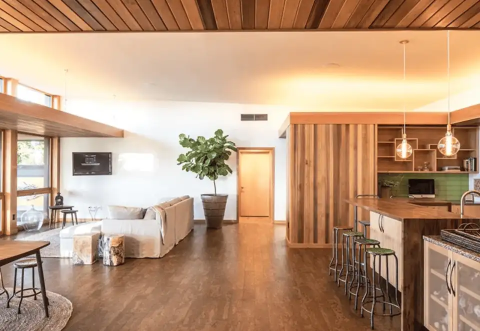 Nestled in the rolling terrain of the Pacific Northwest’s Black Hills on the outskirts of Olympia, Washington, Delphi Haus artfully marries Passive House and universal design in a beautiful single-story modern home. Surrounded by mountains and filled with a soft yellow glow that radiates from the top of yellow-painted soffits extending into the living room, the home was designed for the long-term health and well-being of its owners, Kelly and Laura, and the land they love.